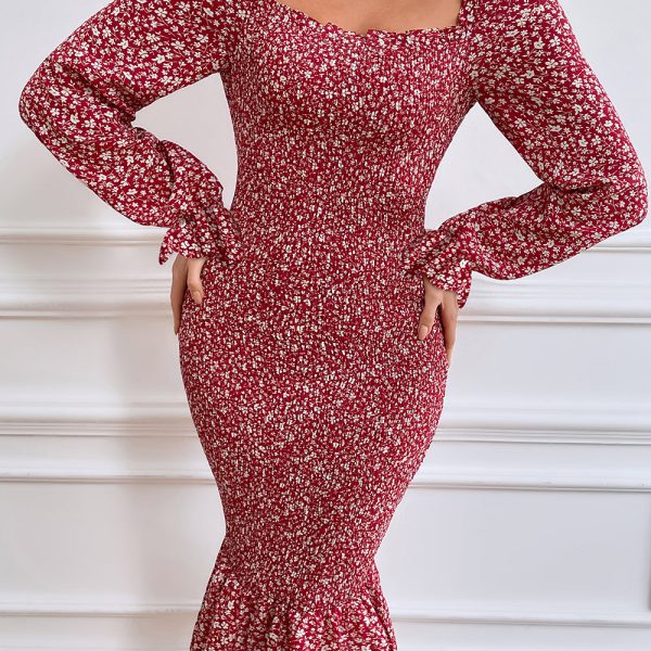 Women Ruffle Mermaid Square Neck Smocked Dress