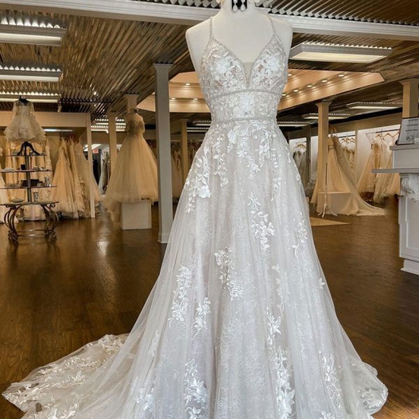 Unique v neck tulle lace long prom dress, lace wedding dress