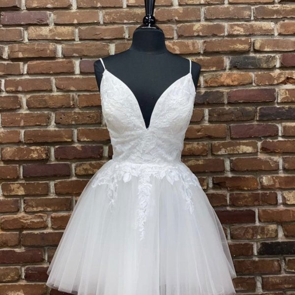 White v neck tulle lace short prom dress, white homecoming dress
