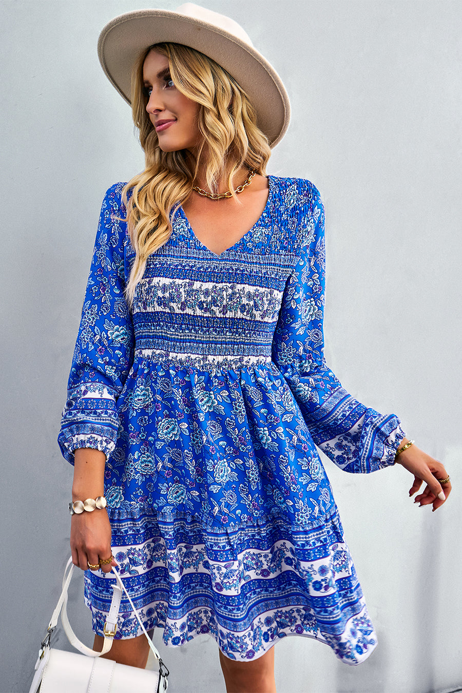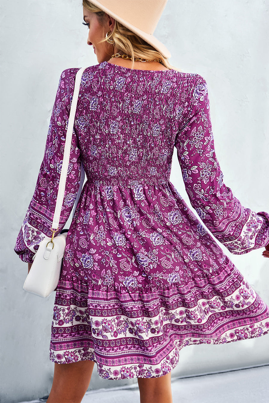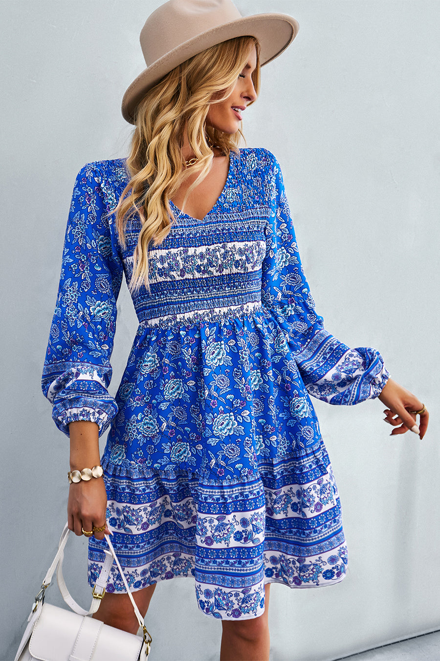 / Smock V Neck Floral Print Ruffle Long Puff Sleeve Mini Boho Dress