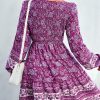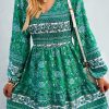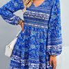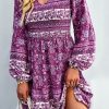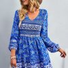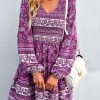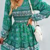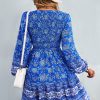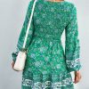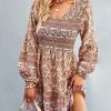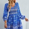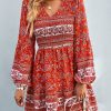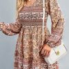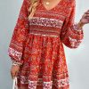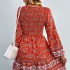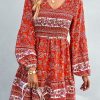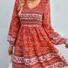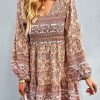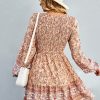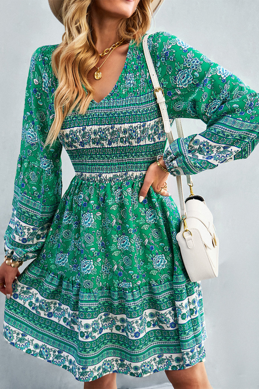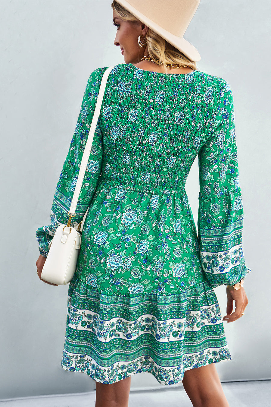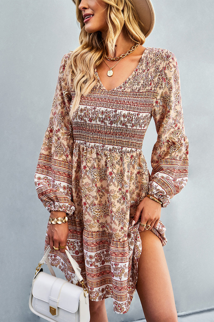 / Smock V Neck Floral Print Ruffle Long Puff Sleeve Mini Boho Dress
