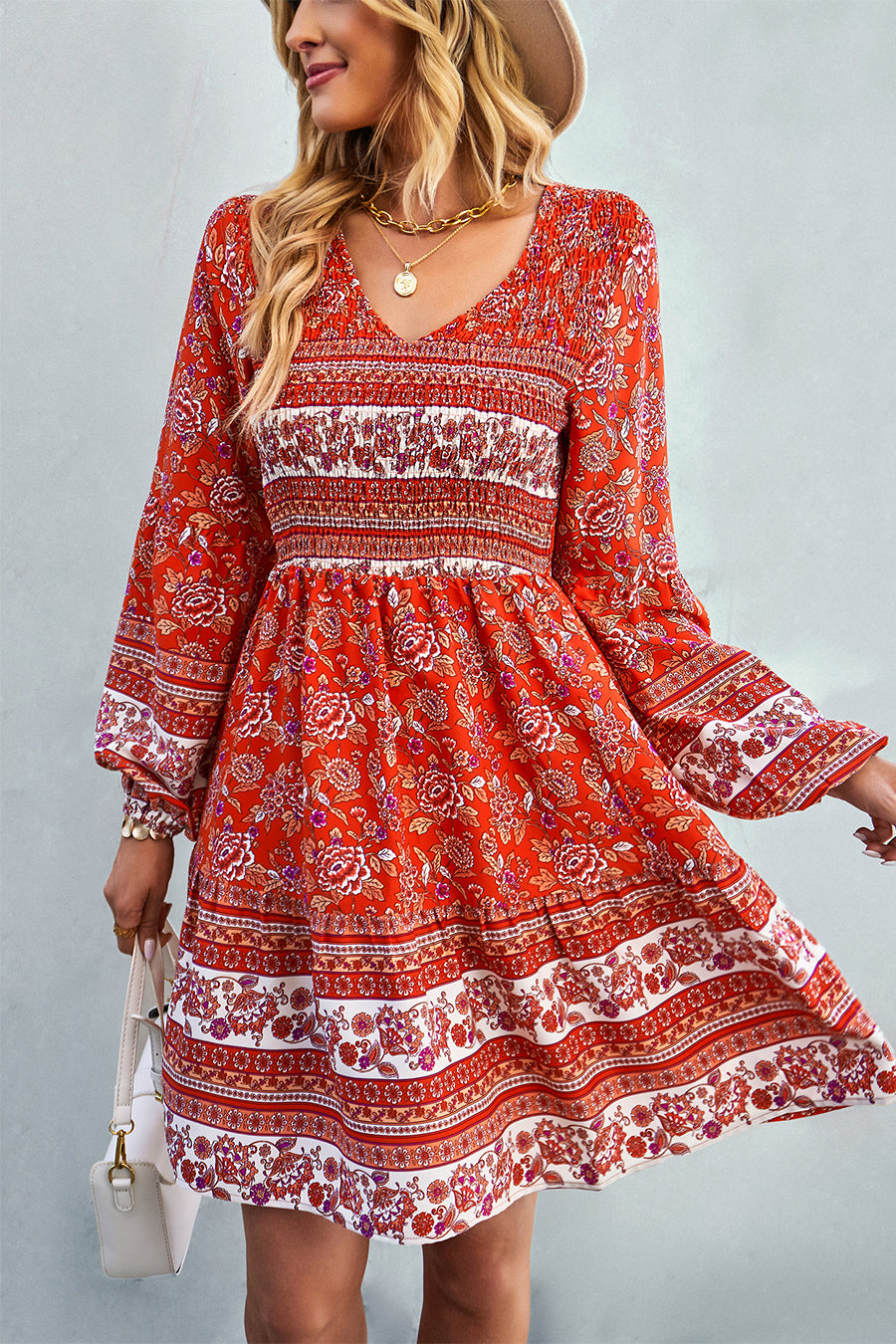 Smock V Neck Floral Print Ruffle Long Puff Sleeve Mini Boho Dress