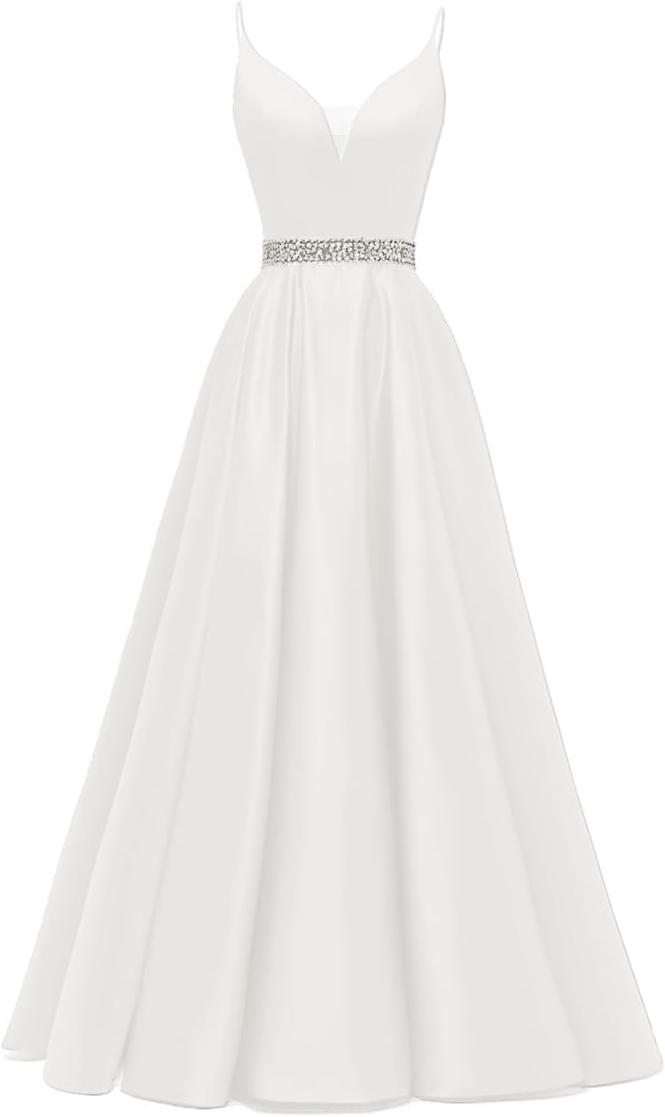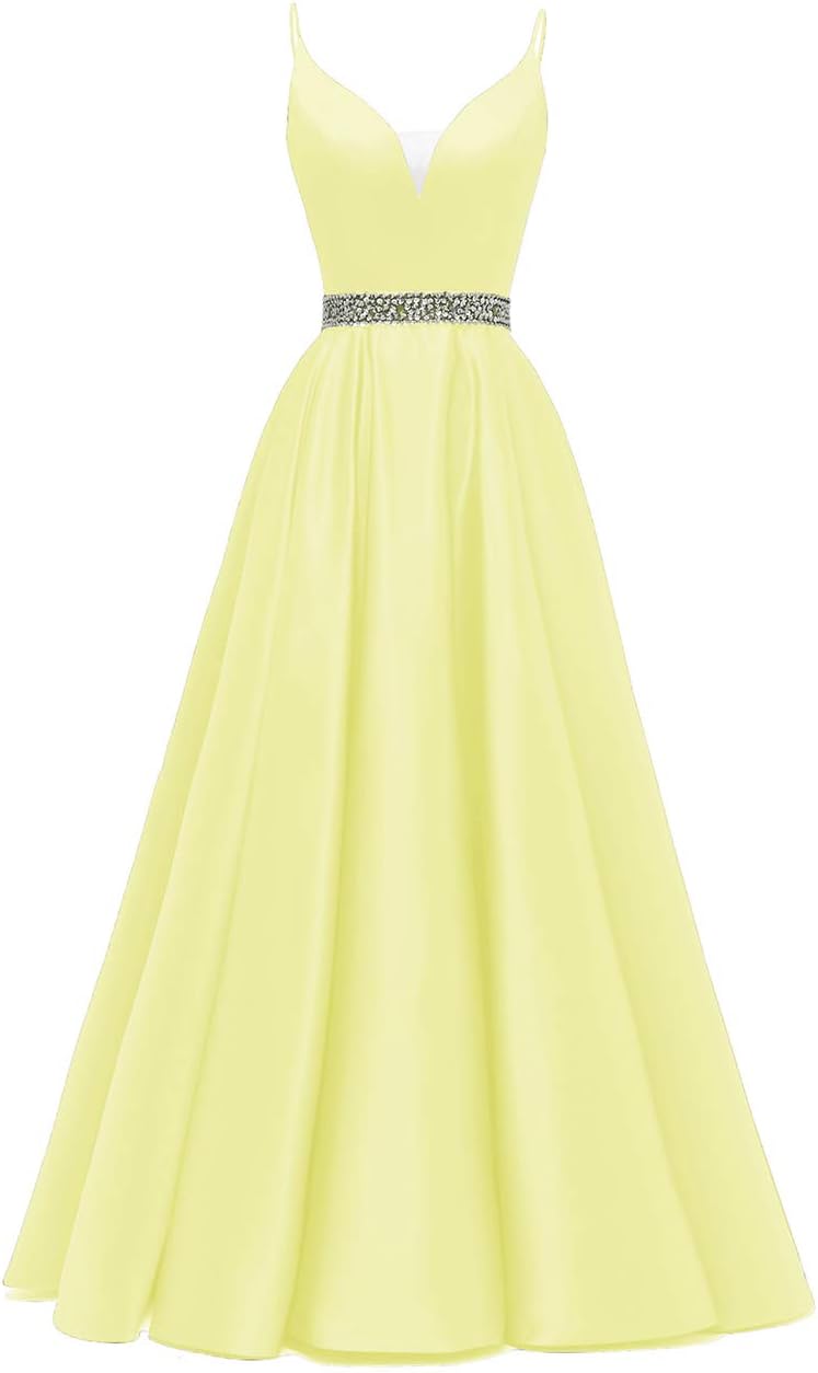 / Spaghetti Straps Prom Dress Long Satin Beaded V-Neck Formal Evening Party Ball Gowns with Pockets