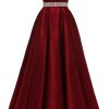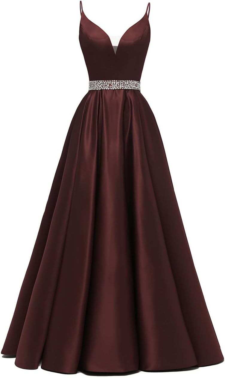 Spaghetti Straps Prom Dress Long Satin Beaded V-Neck Formal Evening Party Ball Gowns with Pockets