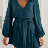 V Neck Long Puff Sleeve Belted Short Party Dress
