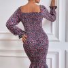 / Long Puff Sleeve Floral Midi Bodycon Dress