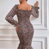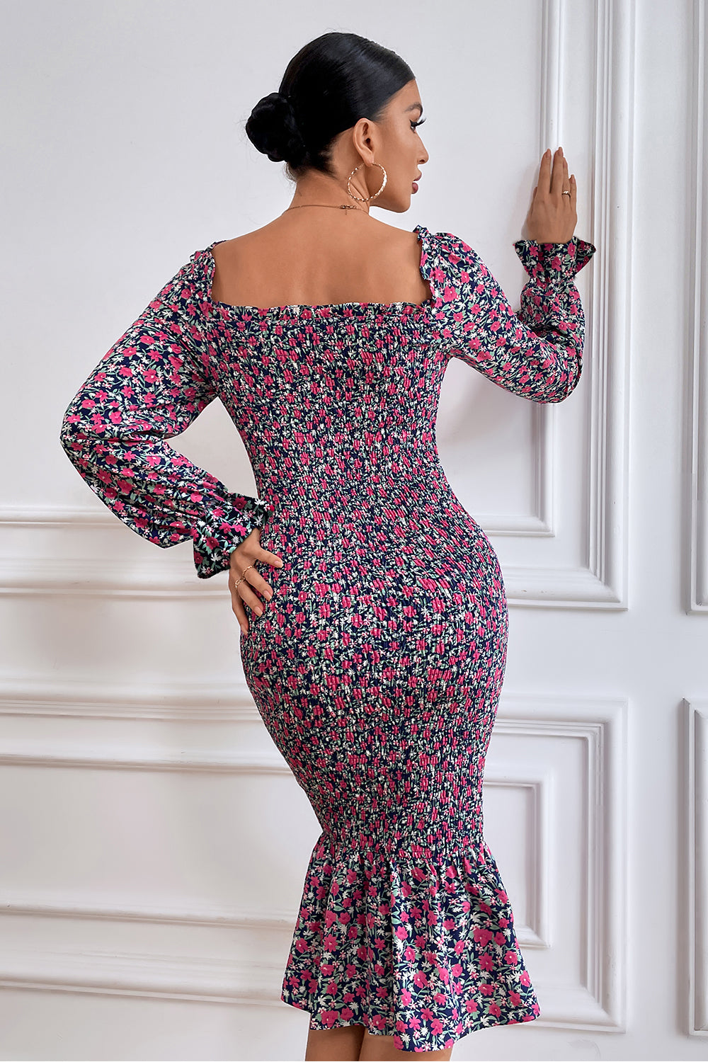 Long Puff Sleeve Floral Midi Bodycon Dress