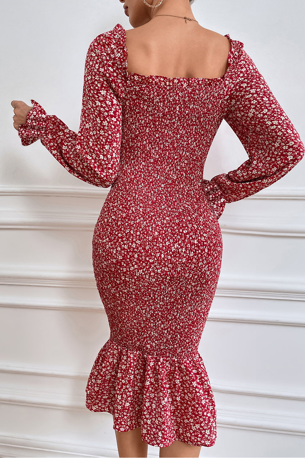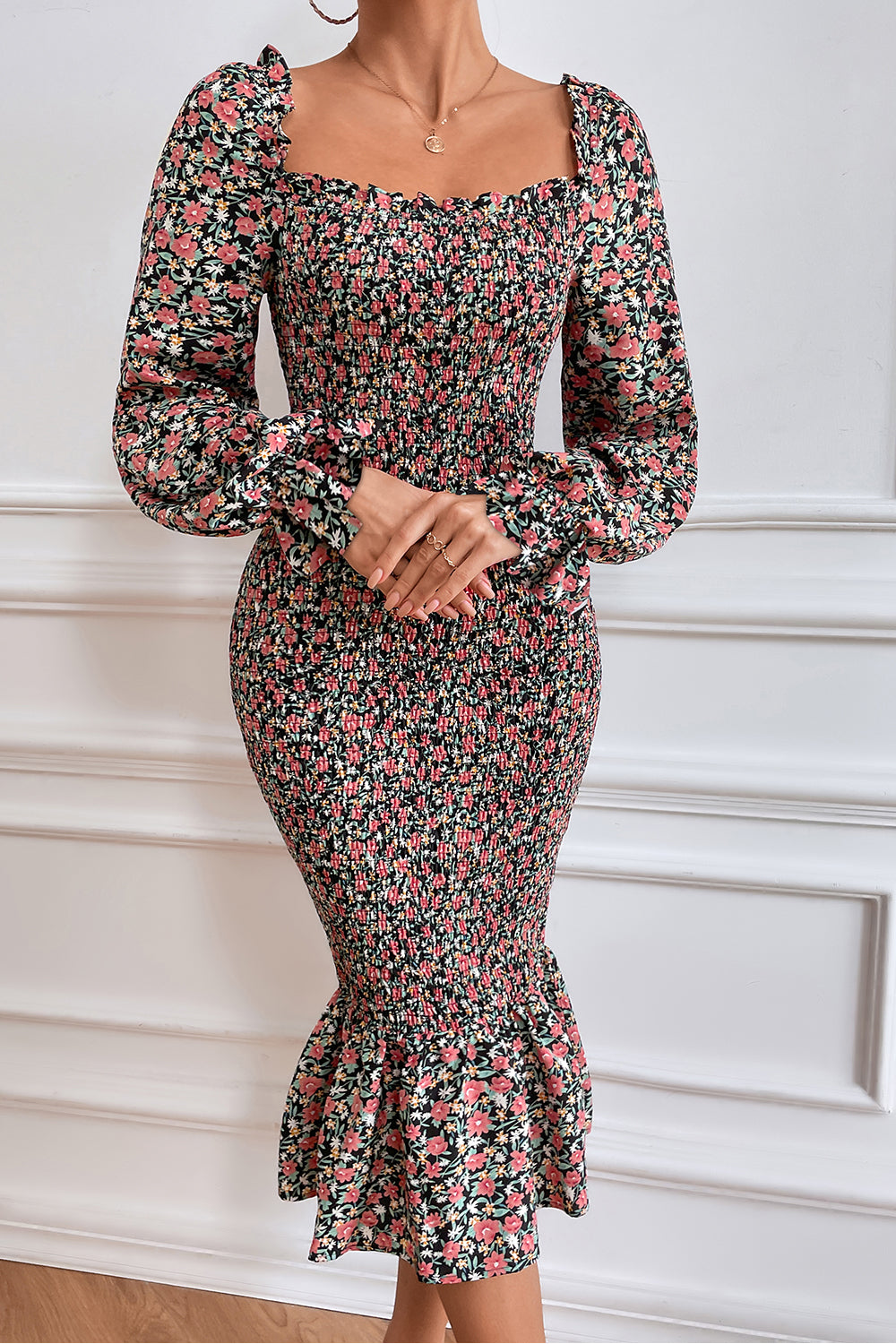 Long Puff Sleeve Floral Midi Bodycon Dress quantity